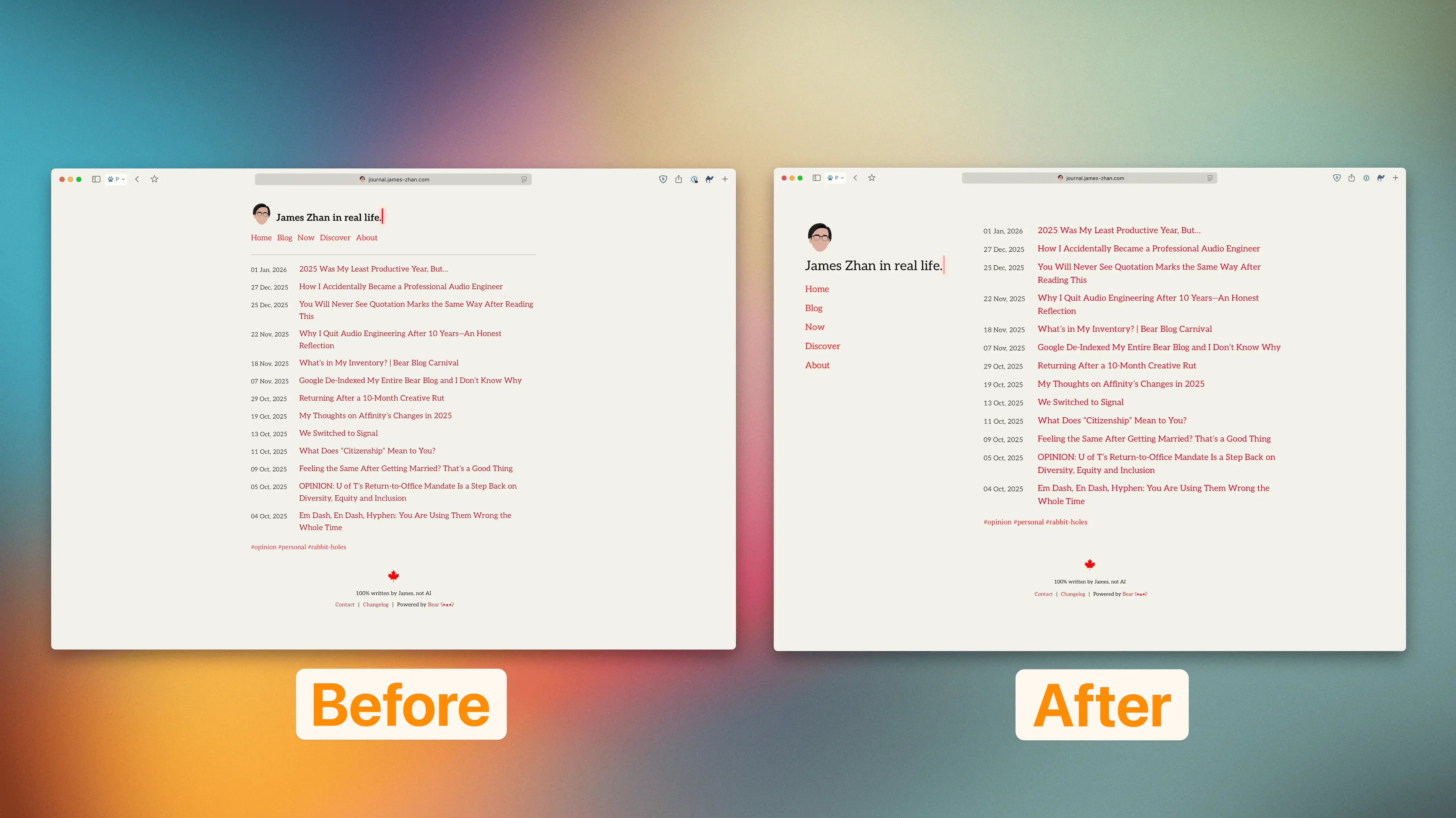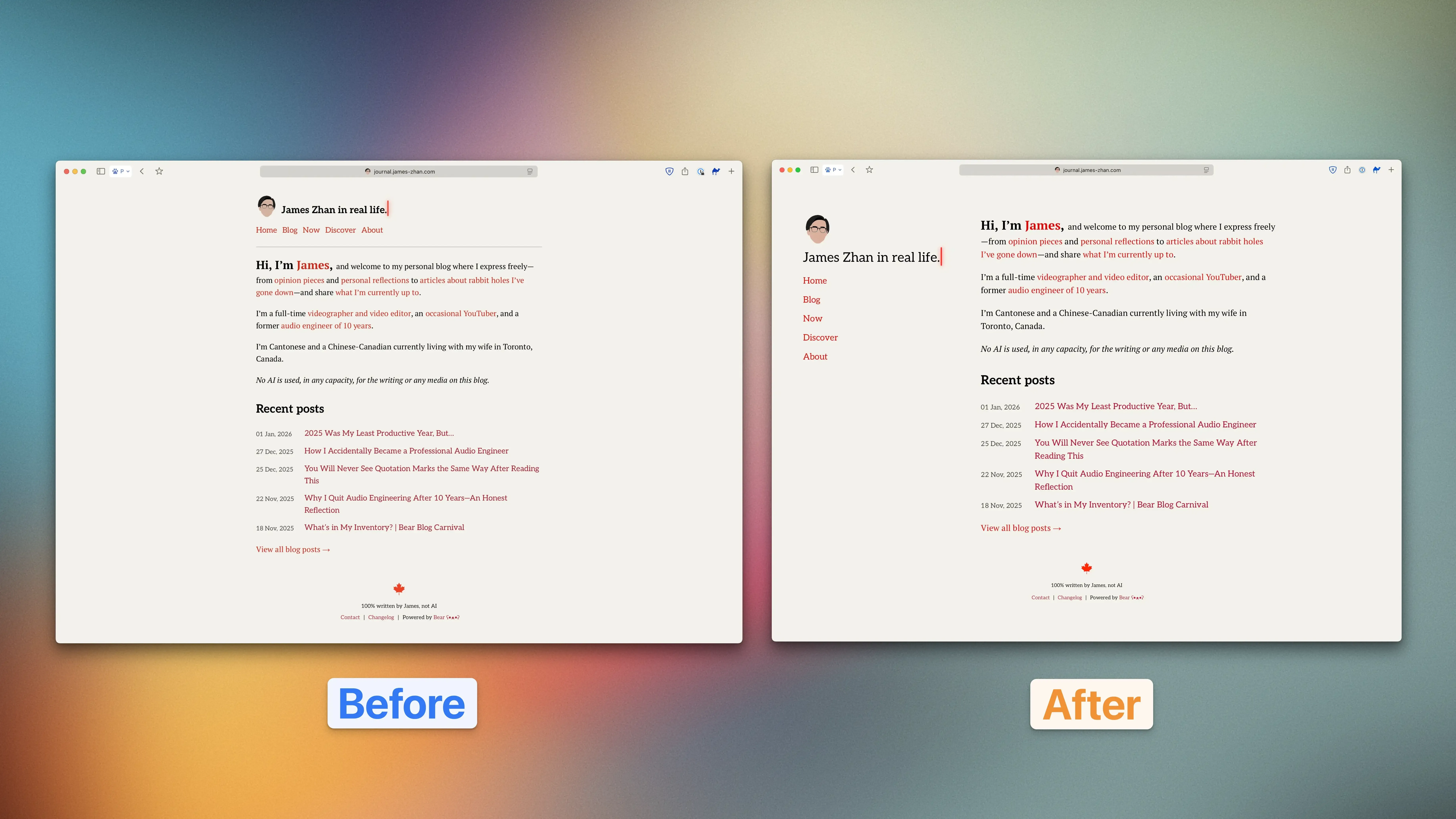 Thanks to my obsession over design and aesthetics, I’d been brainstorming for ways to improve my blog’s design because I wasn’t 100% happy with how it looked as a whole on desktop. If you check the changelog, you’ll see that I’d been tweaking the typography and the small details of the blog, such as spacing and decorative elements, trying to follow all the “best practices” for web typography. However, no matter what I changed, I still wasn’t satisfied.