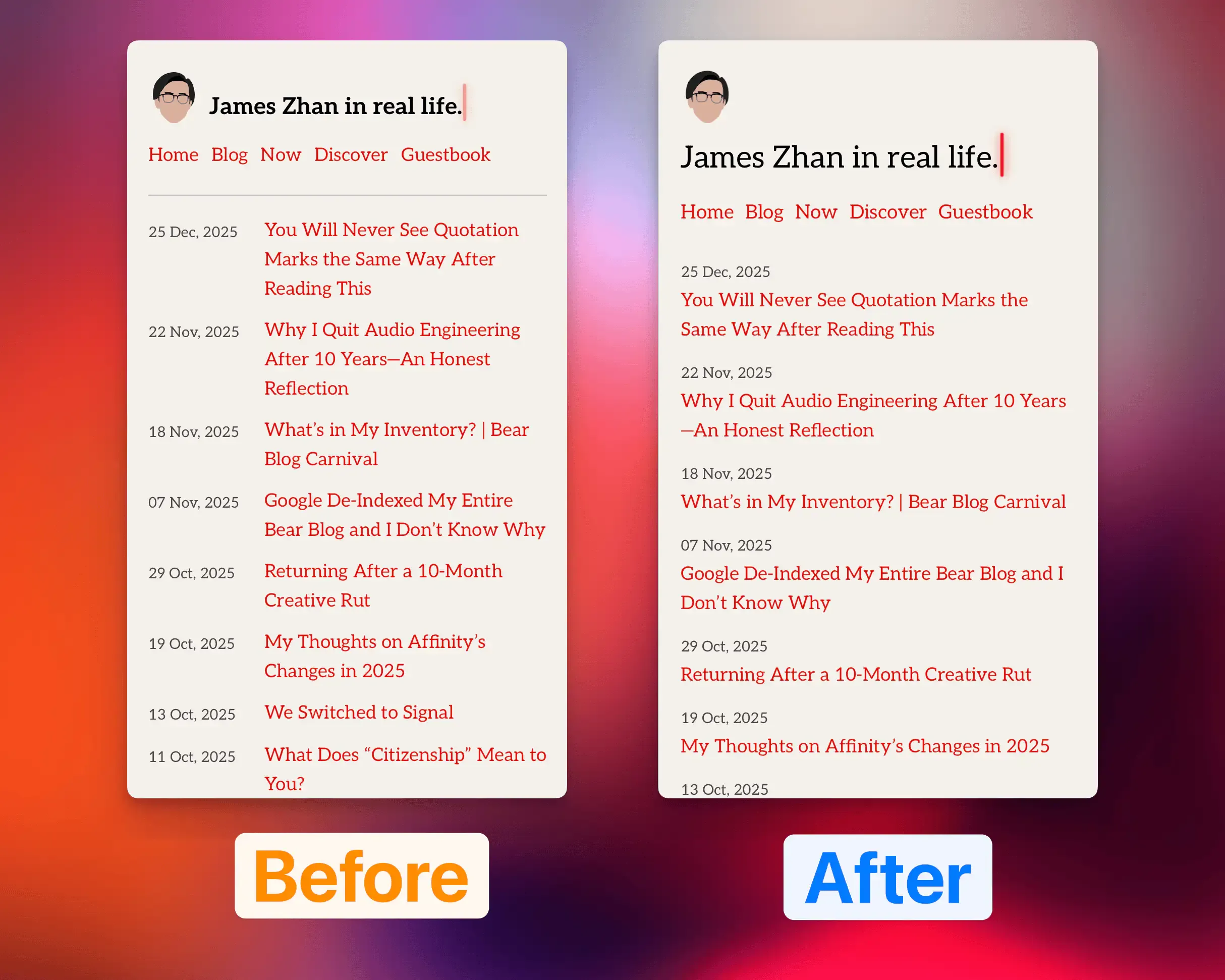 The new design solved all these problems. The dates are more subtle, while the post titles stand out a lot more and are much easier to read.
