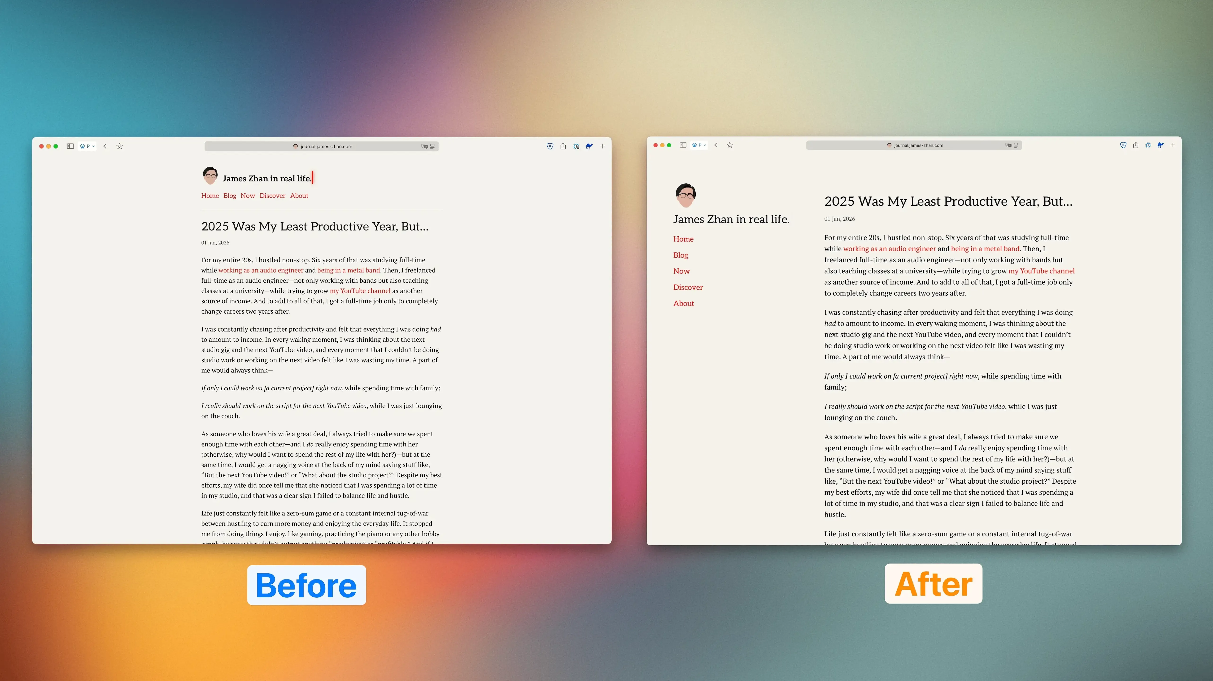 To me, the new design achieves what I envisioned in the first place—minimalist and clean in a modern and stylistic way, with a slight literary feel (thanks to the serif typefaces). I find that having the site header and navigation links on the side reduces the visual load in the main content (i.e., blog posts) and enhances the visual distinction between those two elements, thereby reducing the cognitive load when someone visits the blog. I also like that there’s much less white space overall, which I think makes the design feel more modern (i.e., designed for high res displays).